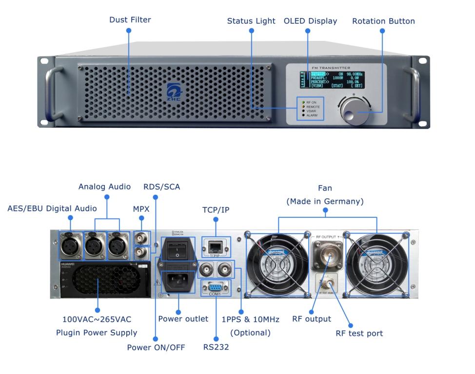 ZHC618F-500W/LIGHT stereo FM radio transmitter is an integrated high-quality FM transmitter that stereo-encodes the input left and right channel audio signals and adjusts the FM modulation to the broadcast band, then RF amplify to the 500W output power for wireless broadcasting. The transmitter adopts the most advanced software radio technology to achieve the international leading level of product performance indicators.